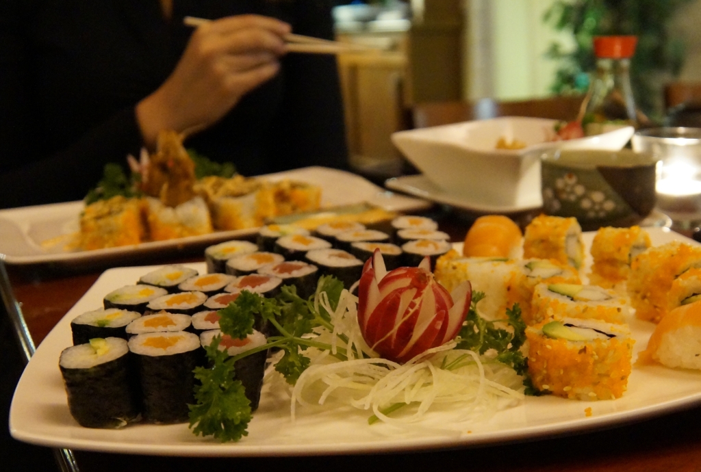 Low prices, excellent and prompt service. Sake sushi bar, tbilisi, georgia. Japanese style tuna tataki (seared) with special sake garlic sauce & crunch onion on top.